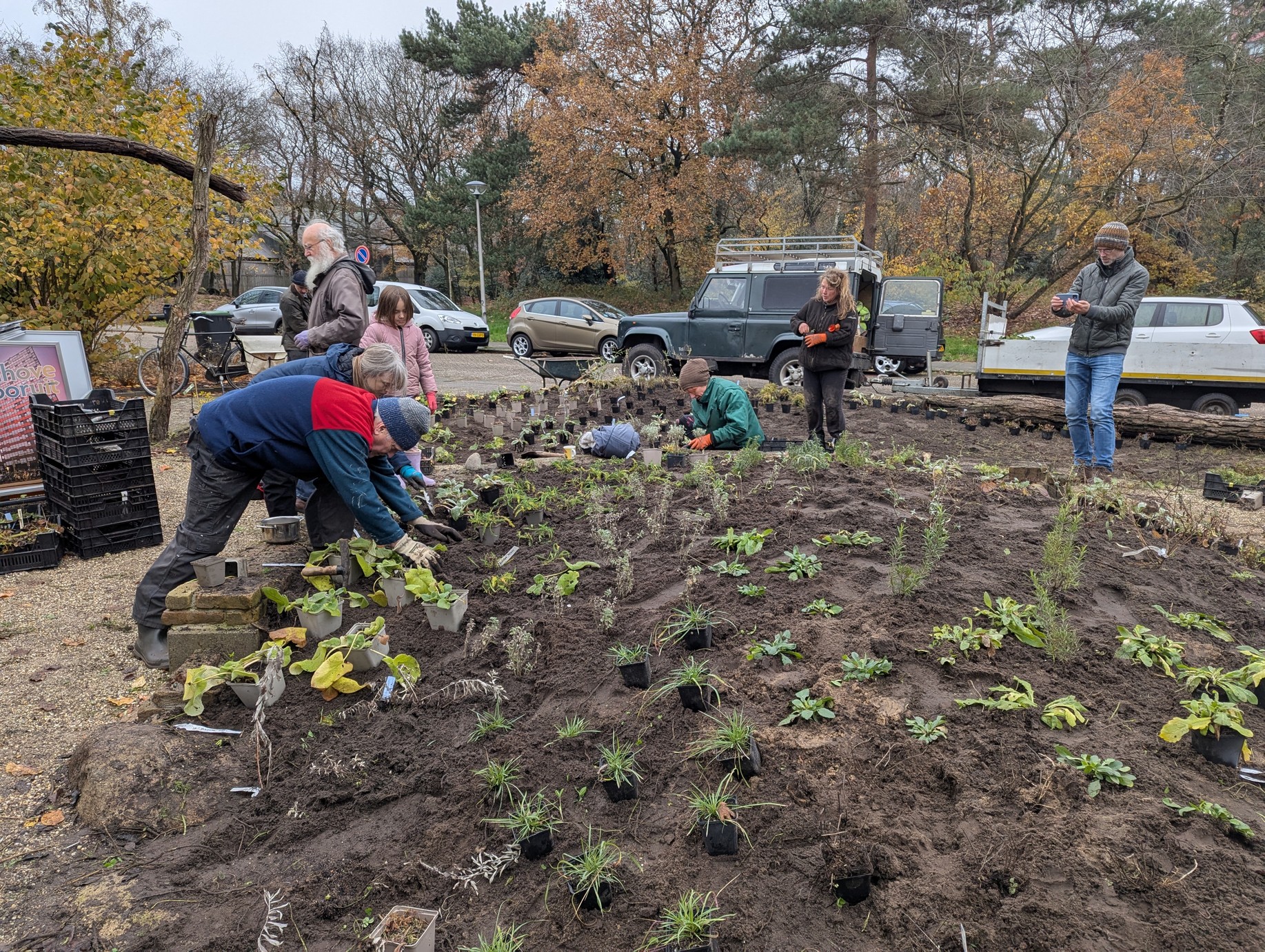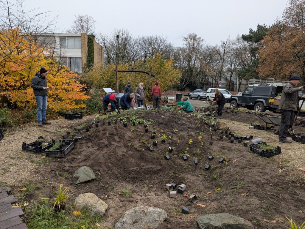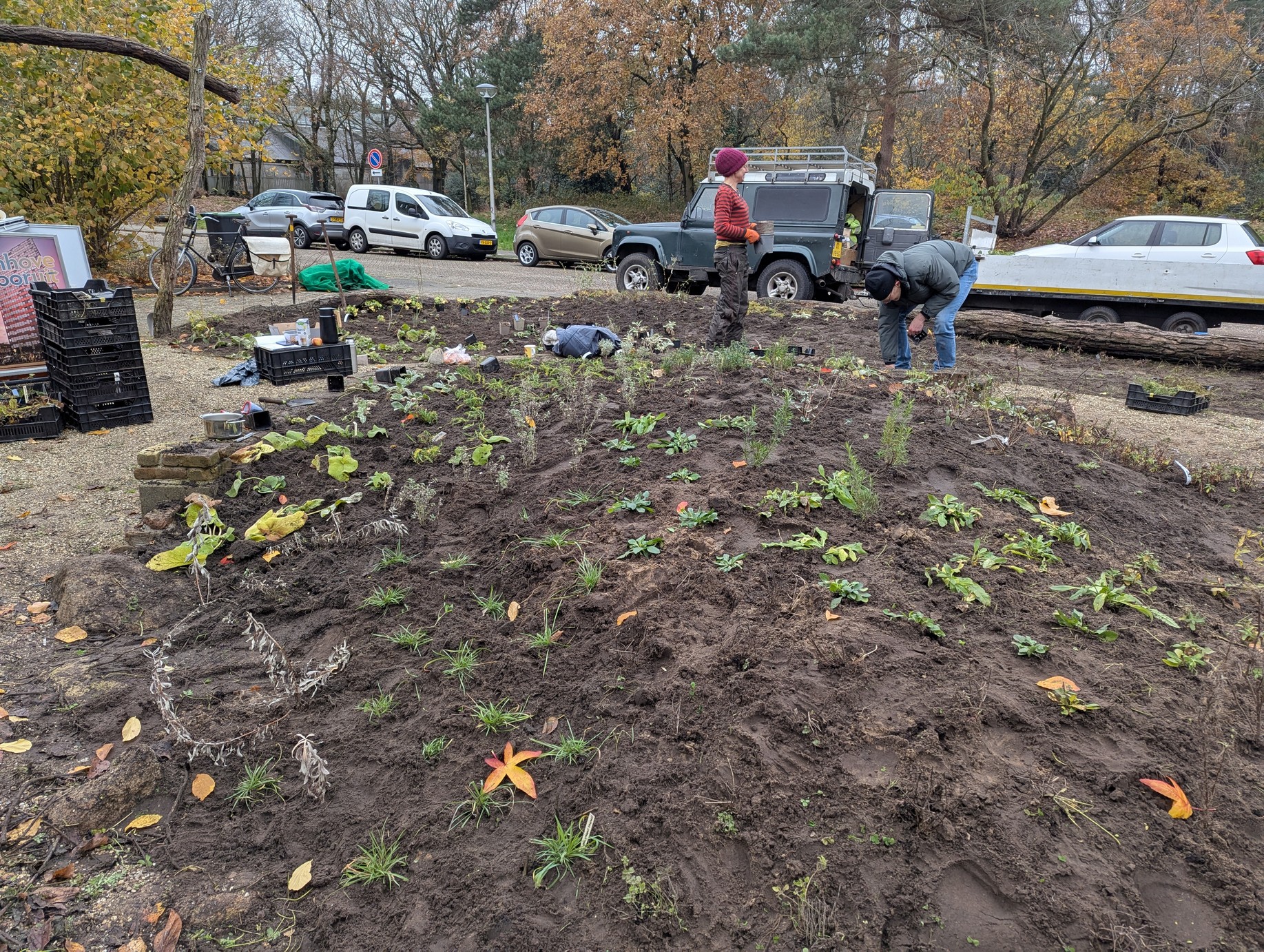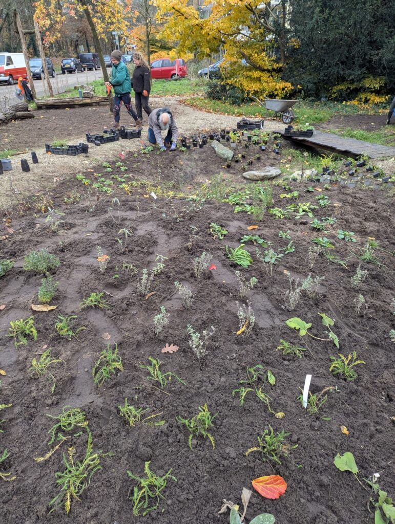 De tuin wordt verder beplant op 23 november. Een klein groepje bewoners heeft samen met de werkzaamheden uitgevoerd. De groenbemesters zijn eerst verwijderd. Dit is tijdelijke beplanting die gebruikt wordt om de bodem te verbeteren en te voorkomen dat voedinstoffen uit te bodem spoelen. Daarna zijn de nauwkeurig gekozen planten in de grond gezet. Ook zijn er veldjes ingezaaid en zijn er bloembollen geplant.