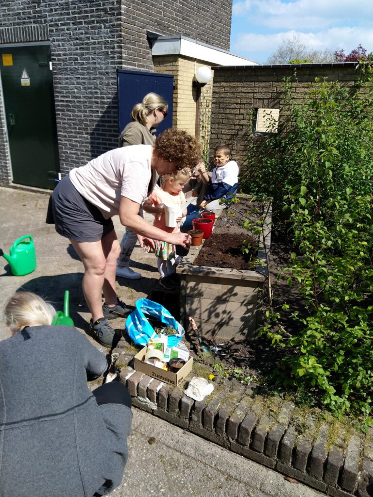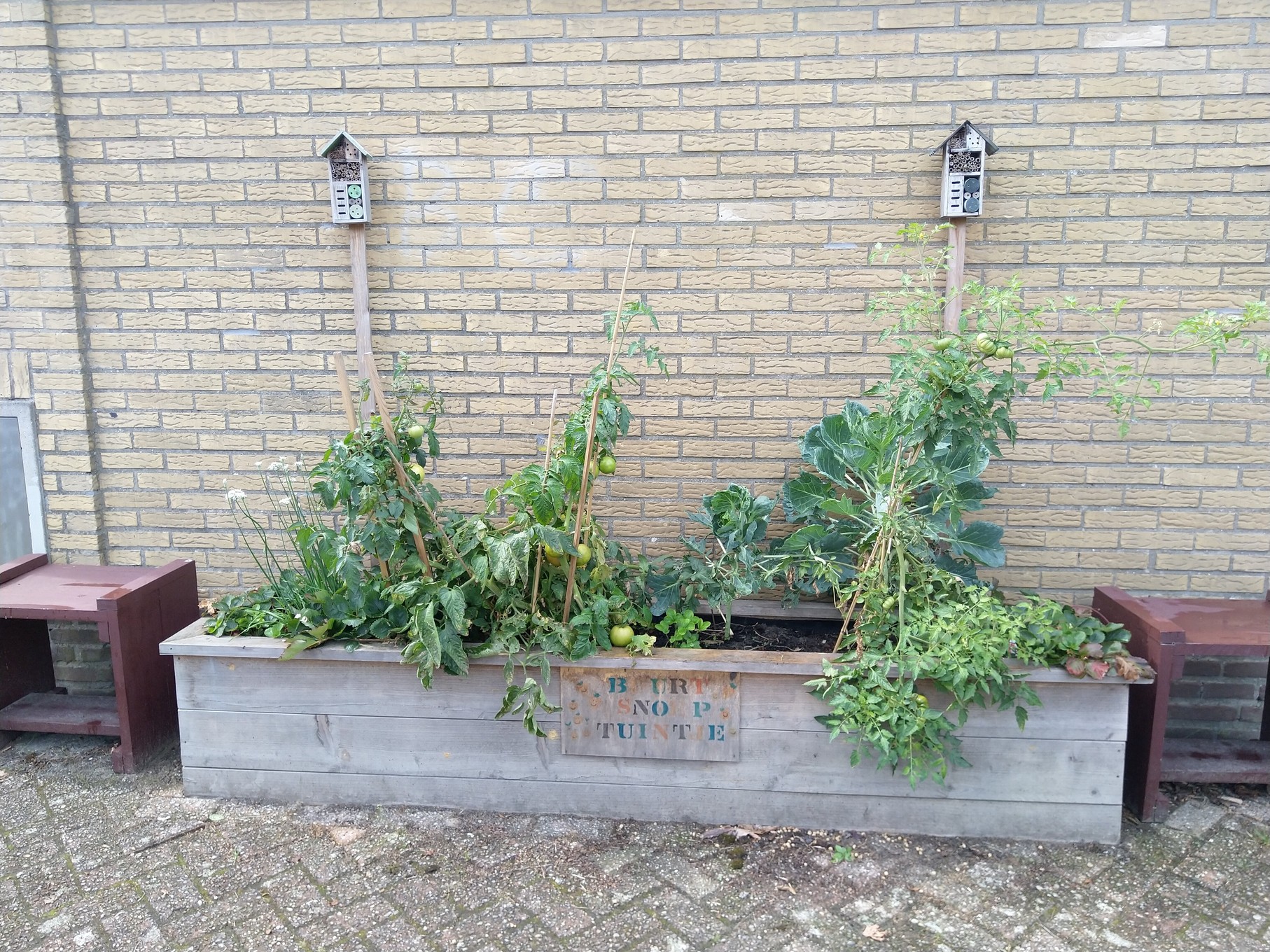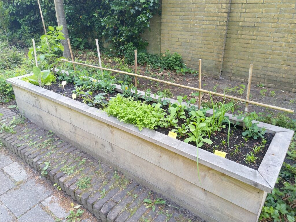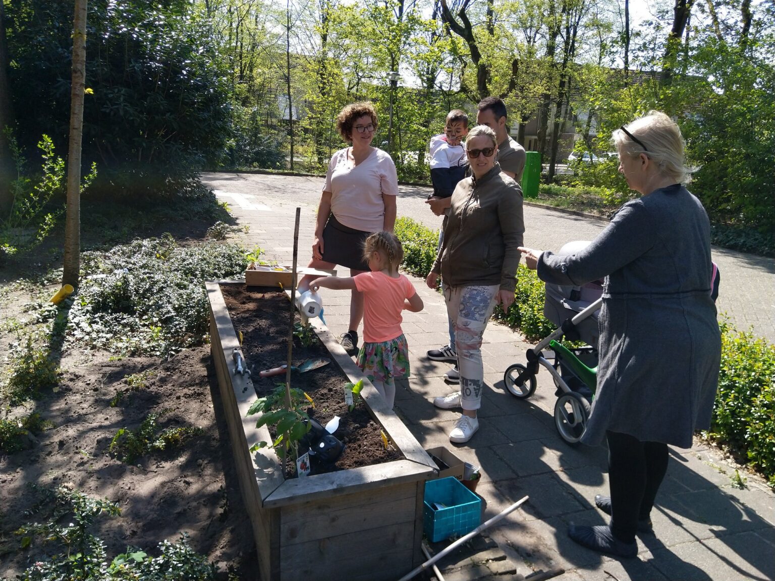 Bewoners van de Fröbellaan hebben eind april samen de moestuinbakken ingericht. Er zijn verschillende zaden geplant, zoals doperwten, sla, bietjes en worteltjes. Ook staan er tomaatjes en aardbijen.